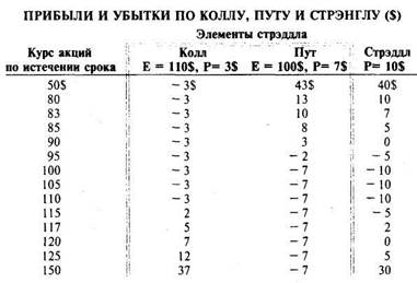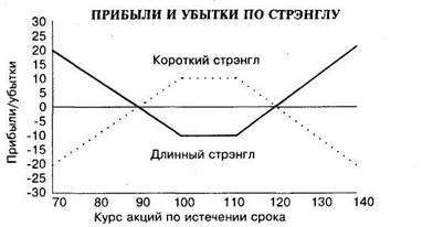 Как можно видеть на этом рисунке, при широком диапазоне курсов акций будут понесены убытки — даже полные убытки всех инвестиций в размере 10 долл. при некоторых значениях курса акций. К примеру, если курс акций по истечении срока опционов будет находиться между 100 и 110 долл. и как пут, так и колл истекут и не будут иметь стоимости, то есть будут получены чистые убытки в размере 10 долл.