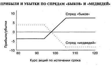Спред «быков» на опционном рынке представляет собой комбинацию покупки и продажи опционов «колл», нацеленную на то, чтобы получить прибыль в случае роста цены лежащего в основе товара 4. Оба колла, задействованные в спреде «быков», имеют одинаковый срок истечения, но разные цены использования. Покупатель спреда «быков» покупает колл с ценой использования, которая меньше курса акций, и продает опцион «колл», чья цена выше использования выше курса акций. Данный спред является именно спредом «быков», поскольку трейдер надеется получить прибыль от роста котировок акций. Данная сделка является именно «спредом», потому что она заключается в покупке одного опциона и в продаже связанного с ним другого опциона. В сравнении с покупкой самих акций спред «быков» с использованием опционов «колл» ограничивает риск, с которым сталкивается трейдер. Однако он при этом и офаничивает потенциальный размер прибыли в сравнении с тем, который может быть получен при проведении операции с самими акциями.