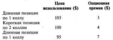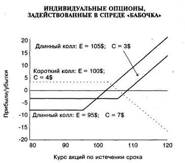 В качестве примера спреда «бабочка» предположим следующее: акции котируются по 100 долл. и трейдер покупает спред путем операций с опционами, которые имеют приводимые ниже цены. Как можно видеть из приводимой ниже таблицы, покупатель спреда «бабочка» продает два колла с близкими к курсу акций ценами исполнения и покупает по одному из таких коллов, у которых цены исполнения выше или ниже курса акций.