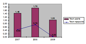 Темп прироста в 2007 году составил 0,45, в 2007 году 0,75, и в 2009 году 0,03, что свидетельствует о том, что кредитные вложения банка с каждым годом возрастают.
