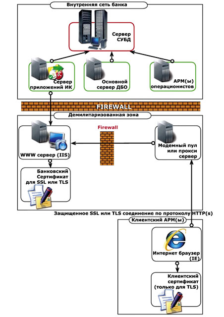 Приведенная схема на рис.7 демонстрирует построение всего комплекса защиты в системе "Интернет-Клиент", включая общие средства обеспечения безопасности информационных ресурсов банка.