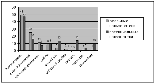 Среди потенциальных пользователей виды кредитования распределились следующим образом: покупка в кредит бытовой и аудио-, видеотехники (47 и 16%); ипотечный кредит (14%); автокредита (13%); образовательный кредит (10%); кредит на приобретение мебели (9%). При этом процент потенциальных пользователей, желающих взять кредит на покупку автомобиля и ипотечный кредит, выше, чем процент реальных потребителей.