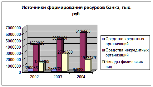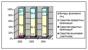 Как можно видеть из приведенных иллюстраций, основные средства пополнения кредитных ресурсов банка в 2002-2004 годах составляли средства некредитных организаций.