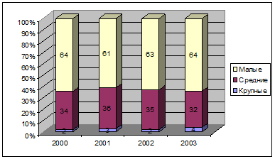 Рис. 13. Распределение невозвращенных кредитов по малым, средним и крупным предприятиям, в %