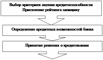Кредитная политика банка должна обязательно учитывать возможность кредитных рисков, предварять их появление и грамотно управлять ими. Для этого банки предварительно стараются определить кредитоспособность лица, запрашивающего кредит. Традиционно процесс оценки кредитоспособности Заемщика состоит из нескольких этапов. (Рис. 1).