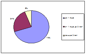 В кредитном портфеле преобладают краткосрочные кредиты, что показывает направленность финансирования АКБ «Московским Банком реконструкции и Развития» (ОАО) текущей деятельности своих клиентов. По состоянию на 01 января 2008 года доля кредитов, предоставленных на срок свыше 1 года, что составило только 30 % общего кредитного портфеля АКБ «МБРР» (ОАО). Основная часть кредитных ресурсов (70%) предоставляется клиентам банка на срок менее 1 года (рисунок 4.6).