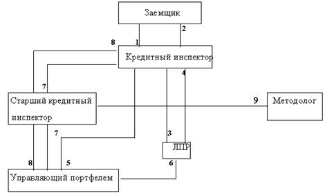 Взаимодействие должностного лица, в служебные полномочия которых входит осуществление общего управления деятельностью сотрудников кредитного подразделения банка, обозначаемого как "старший кредитный инспектор", с кредитным инспектором и управляющим портфелем носит двусторонний характер. Кредитный инспектор и управляющий портфелем предоставляют учетные данные о текущем состоянии и динамике показателей кредитного риска (стрелка 7). Старший кредитный инспектор информирует об изменениях, касающихся организации их деятельности (стрелка 8).
