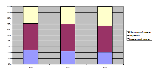 Таким образом, в структуре персонала за 2006-2008 гг. сократилась доля управленческого персонала и специалистов, и увеличилась доля обслуживающего персонала.