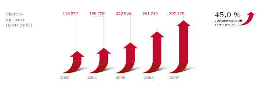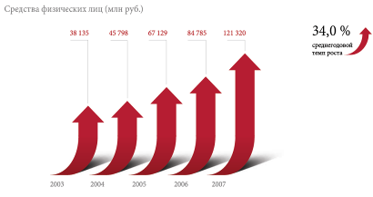 По итогам 2007 года общий объем привлеченных денежных средств направления Private Banking превысил 44 млрд рублей при росте клиентской базы на 25,1 % по сравнению с началом 2007 года.