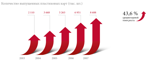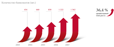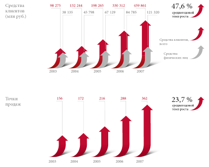 Сумма привлеченных средств клиентов и выпущенных долговых обязательств увеличилась в 4,7 раза – до 459,9 млрд. рублей. Количество точек продаж выросло в 2,3 раза: с 156 в 2003-м до 362 – в 2007 году. Сегодня большая часть офисов сосредоточена в регионах – 244, при этом в Москве и Московской области расположено 118 точек продаж. Кроме того, финансовые услуги оказываются в 471 отделении Почты России в Московском регионе.
