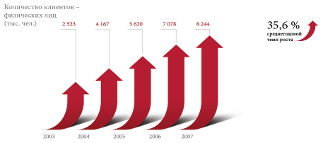 Рост числа клиентов – физических лиц в 2007 году составил 17 %, (количество на конец 2007 года – 8,2 млн. человек) (рис. 2.7, 2.8).
