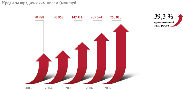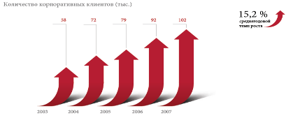 Корпоративный бизнес в 2007 году развивался стабильно. Рост клиентской базы Банка в 2007 году составил 11 %, количество клиентов – юридических лиц достигло 102,5 тыс.