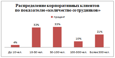 По данным таблицы можно сделать вывод, что в настоящий момент клиентами банка являются компании с коллективом от 10 до 50 человек и от 50 до 100, то есть, компании, которые не являются мелкими.