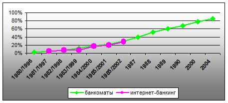 Обнаруживается практическая полная корреляция этих процессов со сдвигом ровно в 16 лет. В изменении психологического восприятия технического прогресса клиентурой кредитных организаций играют роль и демографические факторы, и повышение компьютерной грамотности населения в целом, и конкурентные условия современной банковской сферы. Поэтому попытки углубленого проникновения в проблематику ДБО, в том числе, Интернет – банкинг, весьма современны.