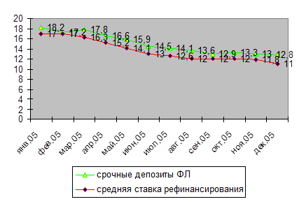Фактическая стоимость срочных депозитов физических лиц в 2005 году в национальной валюте составила 14,8%, в иностранной валюте 5,8%, в декабре 12,8% и 5,8% соответственно, а с учетом формирования фонда обязательных резервов – 13,2% и 6,5%. Стоимость срочных депозитов физических лиц уменьшилась по сравнению с декабрем 2004 года в национальной валюте на 2,1 процентного пункта (при снижении ставки рефинансирования на 6 пунктов с 17% годовых на 01.01.2005 до 11% на 01.01.2006), а в иностранной валюте на 0,6 пункта. Динамика фактических процентных ставок представлена на рис. 1.5.