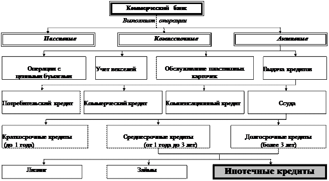 Несомненно, что ипотечный кредит является активной операцией коммерческого банка и пассивной операцией получателя кредита. Для выявления места ипотечного кредитования в системе активных операций банка рассмотрим структуру операций банка (приведено на рисунок 1). На основании приведенной схемы, по нашему мнению, можно сделать вывод, что ипотечные кредиты относятся к средне- и долгосрочным кредитам, выдаваемым банками юридическим и физическим лицам.