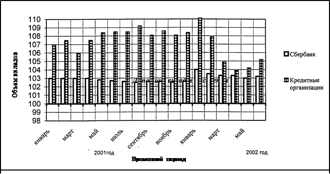 На конец 2001 года его доля составила 92% от всех привлеченных в области депозитов физических лиц, а за первое полугодие прошедшего 2002 года его доля снизилась на 2%. Однако агрессивная политика на данном сегменте рынка остальных кредитных организаций позволила им несколько потеснить Сбербанк. Так, среднемесячные темпы роста частных вкладов в течение рассматриваемого периода у остальных кредитных организаций оказались намного выше, чем у Сбербанка (рисунок 11). Разрушение монополии одной кредитной организации на частные вклады граждан только положительно сказалось на качестве услуг, доходности и диверсификации вкладных операций.