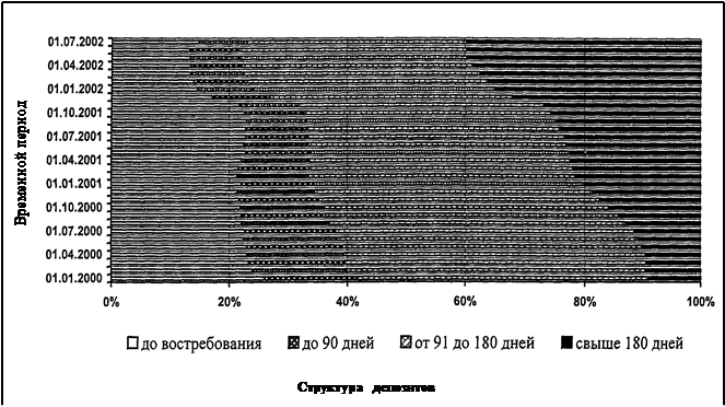 Важное значение при анализе основного компонента привлеченных средств кредитных организаций области – вкладов физических лиц – имеет анализ их временной структуры. В ходе анализа временной структуры прослеживается удлинение сроков вкладных операций, что и отражено графически. В этом аспекте наибольшее увеличение отмечается по агрегированной группе вкладов длительностью свыше года (рисунок 12).