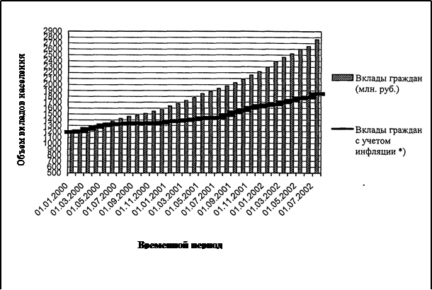 Относительно благоприятно складывающаяся динамика индекса потребительских цен обеспечивала с конца 2001года не только сохранность сбережений, доверенных населением банкам, но и рост их в реальном исчислении.