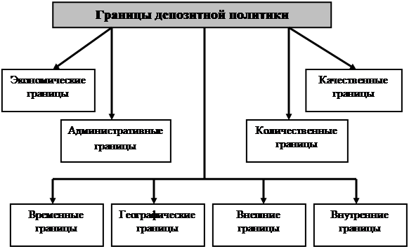 Одним из важных вопросов теоретической части дипломной работы является вопрос о границах депозитной политики коммерческого банка, под которыми понимается определенный допустимый предел аккумулирования банком временно свободных денежных средств юридических и физических лиц. При этом дается классификация этих границ по следующим признакам: