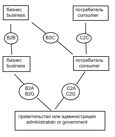 «B2A»или «B2G» - (Business to Administration, Government) - бизнес -правительство - сделки осуществляются между коммерческим предприятием и правительственной организацией, как правило, в форме государственных закупок.