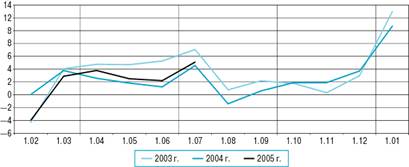 По данным Росстата, индекс промышленного производства за первые шесть месяцев текущего года составил 104% (за I полугодие 2004 г. - 107,3%). В январе-июне 2005 г. мировые цены на нефть сорта «Юралс» в среднем были равны 45,38 долл. США за баррель (в 2004 г. среднегодовая цена составила 34,62 долл. США за баррель). Цены на другие товары российского экспорта также возросли. В июне 2005 г. отмечались ослабление рубля по отношению к доллару США в номинальном выражении на 2,0% и его укрепление к евро на 7,6% (к декабрю 2004 г.). При этом, по оценкам Банка России, в июне 2005 г. индекс реального эффективного курса рубля к иностранным валютам (прирост к декабрю 2004 г.) составил 8,6%. По результатам первых шести месяцев 2005 г. инфляция составила к декабрю предыдущего года 8% (годом ранее - 6,1%). Рост рублевой денежной массы за I полугодие 2005 г. составил 12,9% (33,6% в годовом выражении за скользящие 12 месяцев) при оценке роста спроса на деньги на 2005 г. в диапазоне 20-32%. Денежный агрегат М2[10] за II квартал 2005 г. увеличился на 10,1%, в то время как в I квартале его прирост составил 2,6%.