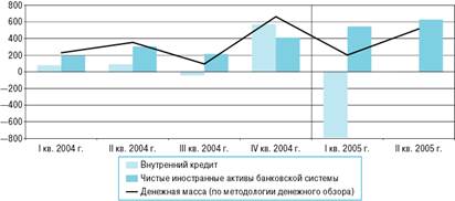 За I полугодие 2005 г. прирост денежной массы по методологии денежного обзора составил 717,2 млрд. руб., при этом в разрезе укрупненных источников чистые иностранные активы банковской системы увеличились на 1169,7 млрд. руб., а внутренний кредит экономике сократился на 783,8 млрд. рублей. Увеличение чистых иностранных активов банковской системы в I полугодии 2005 г. в 2,4 раза превысило аналогичный показатель 2004 года. При этом в I квартале они возросли на 543,4 млрд. руб., а во II квартале - на 626,3 млрд. руб. (в 2004 г. их рост составил 191,8 и 302,7 млрд. руб. соответственно). Если в I полугодии 2004 г. прирост официальных золотовалютных резервов находился на уровне 5-6 млрд. долл. США за квартал, то в текущем году он составлял 13-14 млрд. долл. США за квартал.[15] Что касается внутреннего кредита экономике, то фактором роста денежного предложения оставались банковские кредиты, предоставляемые организациям и населению. Требования к ним в целом за полугодие возросли на 521,6 млрд. руб. (в январе-июне 2004 г. - на 552,0 млрд. руб.). В то же время существенный рост депозитов органов государственного управления в банковской системе (прежде всего в Банке России), обусловивший уменьшение чистых кредитов органам государственного управления на 1310,6 млрд. руб., в итоге привел к сокращению внутреннего кредита экономике. В I полугодии 2004 г. сокращение чистых кредитов органам государственного управления составило 379,1 млрд. руб. и не вызвало уменьшения внутреннего кредита в целом.