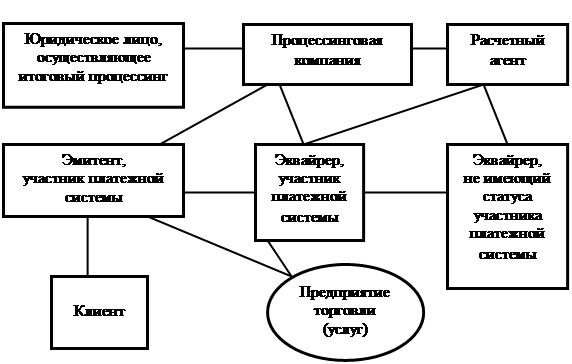 Не нужно объяснять, какие дополнительные трудности при разработке нового, а главное, для правильного применения налоговыми органами уже действующего законодательства в части выявления для целей налогообложения структуры взаимоотношений сторон по операциям с банковскими картами вызывает частое использование в повседневной практике новых, не урегулированных законом видов соглашений. Между тем, как нам кажется, регулирование названных операций возможно и в рамках договоров, известных российскому гражданскому законодательству, – с учетом специфики названных отношений. В этом случае приводившаяся выше структура договорных связей участников расчетов будет выглядеть следующим образом (рис. 2.1):