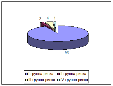 К 1-й группе риска отнесено 93 % кредитов (по классификации Инструкции ЦБ РФ «О порядке формирования и использования резерва на возможные потери по ссудам» от 30.06.1997г. №62а [12]), в юответствии с которой Банк формирует резерв на возможные потери по ссудам в размере 1%. (см. рис.2.4).