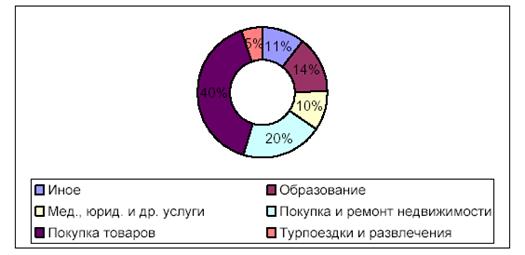 По данным BusinessVision, проводившего опрос среди жителей Москвы, Санкт-Петербурга, Новосибирска, Самары, Казани, Уфы, Краснодара и Нижнего Новгорода, в настоящее время в 41 % случаев потребительский кредит берется с целью приобрести бытовую технику, в 37% - для покупки компьютерной техники, в 15% – одежды, в 6% – автомобиля, в 1% случаев кредит брался на другие нужды (покупка жилья, лечение, туризм). В денежном отношении приобретение товаров также занимает первое место в общем объеме потребительского кредитования, а на второе выходит покупка и ремонт недвижимости (рисунок 3).