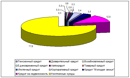 Как видно из рис. 2.1., наибольшую долю в структуре кредитных продуктов для физических лиц занимает кредит «На неотложные нужды» - 77,6 %, кредит на недвижимость занимает 12,8 %, кредит «Молодая семья» - 3,5 %, корпоративный кредит – 3,4 %, автокредит и единовременный кредиты – 0,6 %, остальные кредиты – по 0,3 %.