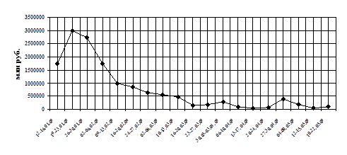 В 2009 году финансовые институты в значительной степени адаптировались к экономической ситуации и высокой. В минувшем 2009 году итоги аукционов прямого РЕПО Банка России также подтверждают гипотезу о том, что государство, в лице ЦБ РФ, остается для банковской системы основным источником ликвидности. Интересно проанализировать динамику объемов сделок прямого РЕПО Банка России с рынком в этот период. На рисунке 1 видно, как постепенно рынок насыщается ликвидностью и, по мере насыщения, падает объем сделок прямого РЕПО.