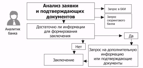 Рисунок 3.4- Пример бизнес-процесса принятия решения о предоставлении ипотечного кредита (до выбора квартиры заемщиком). Общая схема (для примера) и технология формирования заключения аналитиком банка