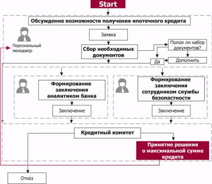 В качестве иллюстрации на рис. 3.4 приведен пример бизнес-процесса работы банка по кредитной заявке — от первого контакта с клиентом до принятия банком предварительного решения о предоставлении кредита на определенную сумму (до выбора заемщиком квартиры). Видно, что тут основную роль в снижении рисков до минимума играет согласованная работа всех сотрудников банка в соответствии с утвержденной схемой принятия решения.
