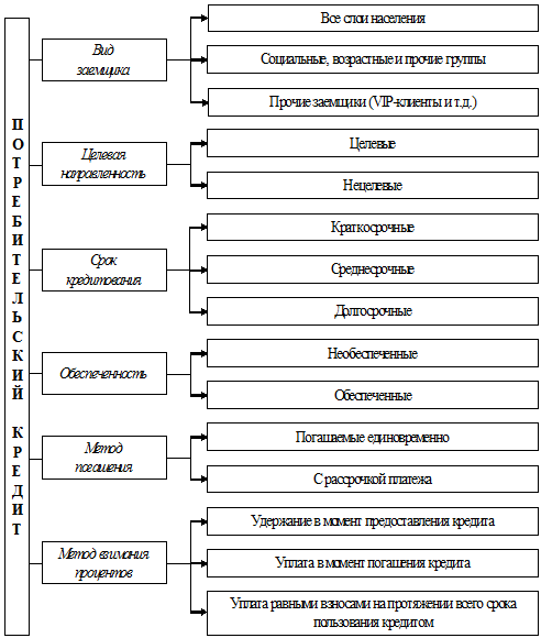 Рисунок 1.1 - Классификация потребительского кредита по виду заемщика, целевой направленности, сроку кредитования, обеспеченности, методу погашения и взимания процентов[33]