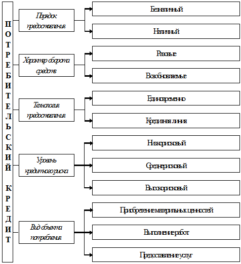 Рисунок 1.2 - Классификация потребительского кредита по порядку и технологии предоставления, характеру оборота средств, уровню кредитного риска, виду объекта потребления[34]