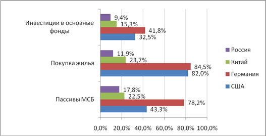 Из приведенных данных видно, что банковские кредиты занимают в ресурсах российских малых и средних предприятий лишь около 18%, в то время как в Германии 78% и 43% в США. При покупке жилья доля банков составляет соответственно 12%, 85% и 82%. Наконец, инвестиции в основные фонды финансируется за счет банковских кредитов в России на 9%, в Германии на 42%, в США на 33%. Данные расчеты показывают отставание банковской системы России от других стран.