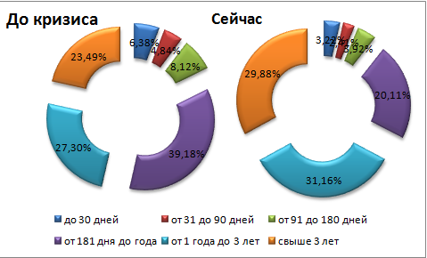 Положение усугубляется тем, что в послекризисный период банки реструктуризировали кредиты, отложили сроки их погашения на более поздний период. В результате значительная часть ресурсов задействована на длительные сроки, поэтому оборачиваемость кредитных ресурсов резко замедлилась.