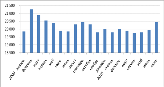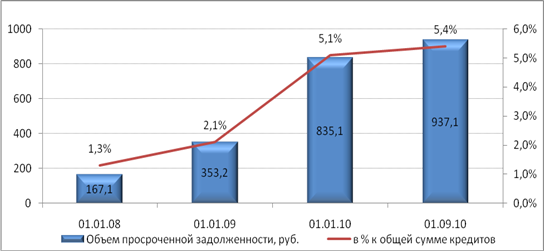 Из данных, приведенных ЦБ РФ и отраженных в графике, прослеживается тенденция роста объема невозвращенных кредитов. При чем резкое увеличение портфеля просроченной задолженности наблюдается именно в период с середины 2008 до начала 2010 года. Далее мы видим стабилизацию роста от объема, что можно связать с общей стагнацией рынка кредитования.