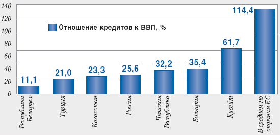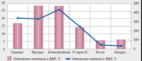 На макроэкономическом уровне основным показателем, характеризующим текущее состояние банковского сектора Беларуси, является соотношение активов и капитала банков с ВВП, отношение выданных кредитов и привлеченных вкладов к ВВП. В нашей стране отношение активов и капитала банков к ВВП гораздо ниже, чем в развитых странах (рисунок 1).