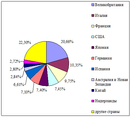В мировом обороте факторинга, который в 2008 году составил немалую сумму в один с лишним триллион евро, более 70 % приходится на европейские страны [21]. Следом идут страны Азии - около 13 % мирового оборота, и лишь за ними Америка - чуть больше 12 %. Безусловный лидер на мировом рынке факторинга - Великобритания. Здесь насчитывается около 100 факторинговых компаний, деятельность которых не подлежит лицензированию, что позволяет им беспрепятственно развиваться. Суммарный факторинговый оборот Объединенного Королевства в 2008 году составил почти 250 млрд. евро, то есть более 20% мирового (рис.2).