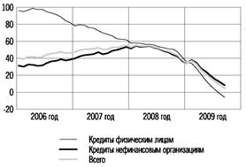 В 2009 году происходило существенное сокращение объема выдаваемых банковских кредитов, что привело к снижению годовых темпов прироста задолженности по кредитам нефинансовым организациям и физическим лицам. Значительное уменьшение рублевой депозитной базы, произошедшее в начале года, а также продолжающееся сокращение поступлений средств, привлекаемых на международных финансовых рынках, существенно ограничивали предложение кредитов со стороны российской банковской системы. В этот же период продолжился рост просроченной задолженности по кредитам нефинансовым организациям и населению. Это стало дополнительным фактором, обусловившим ограничение предложения кредитов, так как вынуждало банки действовать более осторожно в связи с ухудшением качества банковских активов и финансового состояния многих заемщиков. Кроме этого на динамике кредитных агрегатов отразилось снижение спроса на кредиты в условиях общего спада экономической активности и высокой стоимости заимствований на внутреннем рынке. Реализация кредитных рисков в российском банковском секторе и высокая стоимость фондирования для кредитных организаций обусловили в начале 2009 года рост процентных ставок по кредитам нефинансовым организациям, прекратившийся после реализации мер, принятых Банком России.