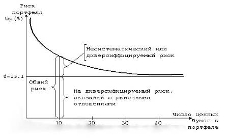 График (рис.2) показывает, что риск по портфелю, состоящему из акций, представленных на Нью-йоркской фондовой бирже, имеет тенденцию к снижению с увеличением числа акций, входящих в портфель. Полученные данные свидетельствуют, что стандартная девиация по портфелю, состоящему из одной акции на этой бирже, составляет приблизительно 28%. Портфель, содержащий все зарегистрированные на бирже акции (в момент исследования их было 1500), называемый рыночным портфелем, имеет стандартную девиацию около 15,1% [6]. Таким образом, включение в портфель большего количества акций позволяет сократить риск по портфелю практически в два раза.