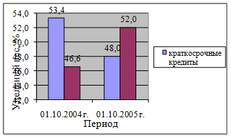 На рис. 1.1 видно, что по данным на 01.10.2004 г. доля краткосрочных кредитов составляла 53,4%, однако уже по состоянию на 01.10.2005 г. их доля уменьшилась на 5,4%, составив 48%. Удельный вес долгосрочных кредитов увеличился на 5,4% и по данным на 01.10.2005 г. составил 52%. Это говорит о том, что в нашей стране предприятия стремятся обновить свою материальную базу, стремясь избавиться от физического и морального износа производственного оборудования, однако они по прежнему обращаясь в банки за кредитами на осуществление текущей деятельности.