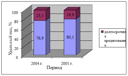 Согласно рис. 1.2 основную долю кредитов хозяйствующим субъектам составляют краткосрочные кредиты, выдаваемые на финансирование текущей деятельности. Удельный вес данных кредитов в общем объеме предоставленных кредитов за 2005 год составил 80,1%, что выше на 3,2% по сравнению с данными год назад, когда он составлял 76,9%. А удельный вес долгосрочных кредитов снизился на 3,2 пункта с 23,1% в 2004 году до 19,9% в 2005 году.