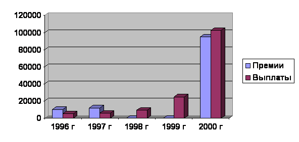 Рис 1. Объём страховых премий и выплат по договорам личного страхования по РФ в 1996-2000 гг.