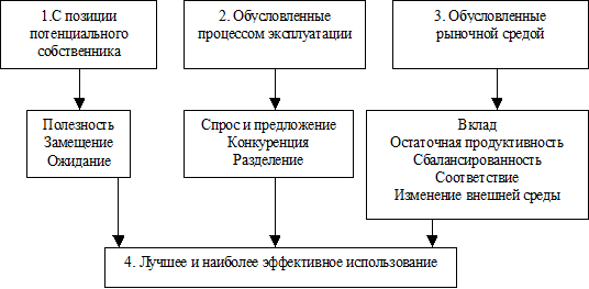 Доходность объекта оценки определяется комбинацией четырех групп факторов: земли со строениями (если участок незастроенный, то только земли), оборудования и технических средств (для незастроенного участка – также зданий и сооружений), рабочей силы и менеджмента. При этом стоимость каждой группы факторов зависит от того, насколько увеличивается стоимость всего объекта оценки от их использования, с учетом имеющихся количественных и качественных характеристик.