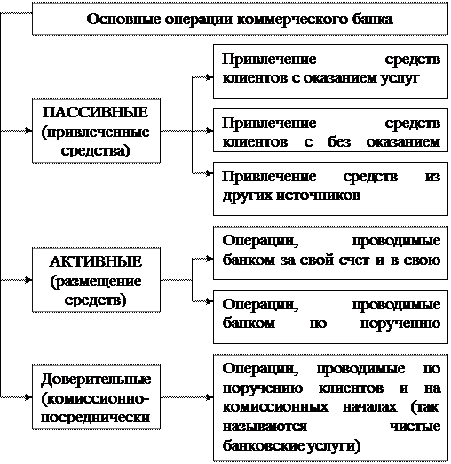 Операции коммерческих банков. Выполняя выше перечисленные функции банки, принимают и размещают денежные вклады, привлекают и предоставляют кредиты, осуществляют расчеты по поручению клиентов и банков-корреспондентов и их кассовое обслуживание, совершают другие операции, которые не противоречат законодательству и предусмотрены их уставами. Эти операции могут проводиться как в рублях, так и в валюте. В деятельности банков выделяют следующие виды операций (рисунок 1.1):