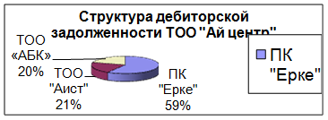 Так, наибольшая доля приходится на ПК «Ерке», которая получила предоплатой сумму в размере 34 540 тыс. тг. за предоставление оборудования по производству пластиковых изделий, а также ТОО «Аист» - 12419,7 тыс. тг., которая должна оплатить за предоставленные ТМЗ. По договору, ТОО «Аист» должен оплатить долг не позднее 1 марта 2005 года. Также ТОО «АБК» имеет долг в размере – 12000 тыс. тг., которая задолжала ТОО «Ай центр» за оказанные услуги. По договорам заключенными между ТОО «Ай центр» и дебиторами максимальным сроком погашения задолженности является июль 2005 года. Структуру дебиторской задолженности можно увидеть на рисунке 5, представленной ниже.