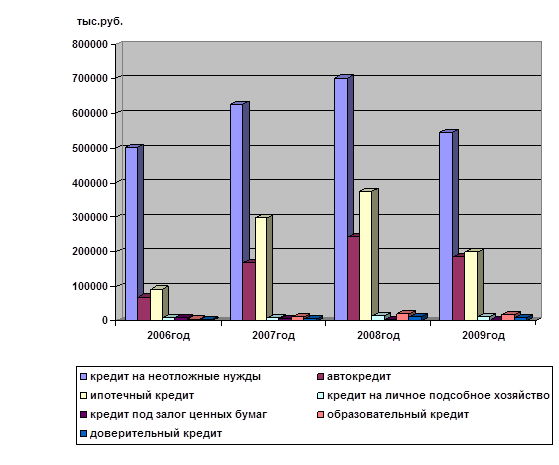 Среди традиционных видов банковской деятельности предоставление кредитов – основная операция, обеспечивающая их доходность и стабильность существования. Выдавая кредиты физическим и юридическим лицам, банк формирует свой кредитный портфель. Таким образом, кредитный портфель банка – это совокупность остатков задолженности по активным кредитным операциям на определенную дату. Существуют различные классификации кредитного портфеля, среди которых можно встретить деление портфеля на валовой (совокупный объем выданных банком кредитов на определенный момент времени) и чистый (валовой портфель за вычетом суммы резервов на покрытие возможных убытков по кредитным операциям) [39, c. 76]. Осуществляя кредитные операции, банк стремится не только к их объемному росту, но и к повышению качества кредитного портфеля. Таким образом, для эффективного управления кредитным портфелем необходим его анализ по различным количественным и качественным характеристикам как в целом по банку, так и по его структурным подразделениям. Количественный анализ предполагает изучение состава и структуры кредитного портфеля банка в динамике (за ряд лет, на квартальные даты отчетного года) по ряду количественных экономических критериев, к которым относят: - объем и структуру кредитных вложений по видам; - структуру кредитных вложений по группам кредитополучателей; - цену кредитования (уровень процентных ставок). - сроки кредитов; - своевременность погашения предоставляемых кредитов; - отраслевую принадлежность; - виды валют; Проведем количественный анализ кредитного портфеля по кредитованию физических лиц за 2006-2009гг. по объему и структуре кредитных вложений для выявления места ипотечных кредитов в кредитном портфеле. Представим структуру кредитного портфеля по кредитованию физических лиц за 2006-2009гг. Нефтекамского отделения №4891 Сбербанка России в виде таблицы 1. Таблица 2.1 - Структура кредитного портфеля по кредитованию физических лиц за 2006-2009гг. Нефтекамского отделения №4891 Сбербанка России.